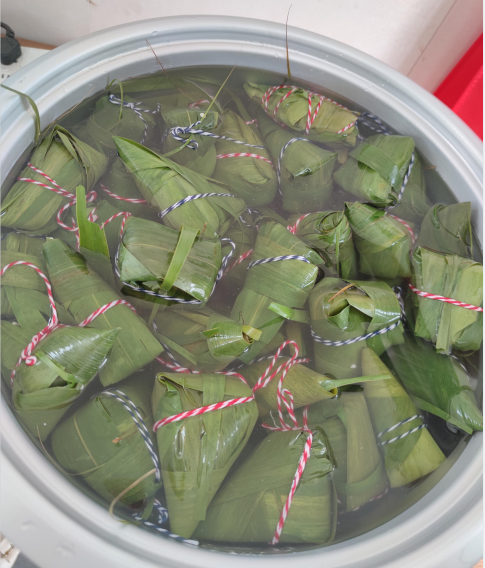 随着包粽子队伍急速扩张,这边压力给到粽叶组,大家纷纷过来帮忙梳理粽叶以确保供应。最后看看,哇喔!人多力量大,硕果累累!