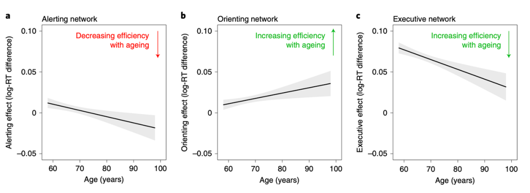 研究团队通过注意力网络测试(attention network test,ANT)发现,虽然参与者的警觉 能力(alerting)会随着年龄有所下降, 但定向(orienting)和执行抑制(executive in hibition)能力却会随着年龄的增长有所改善。